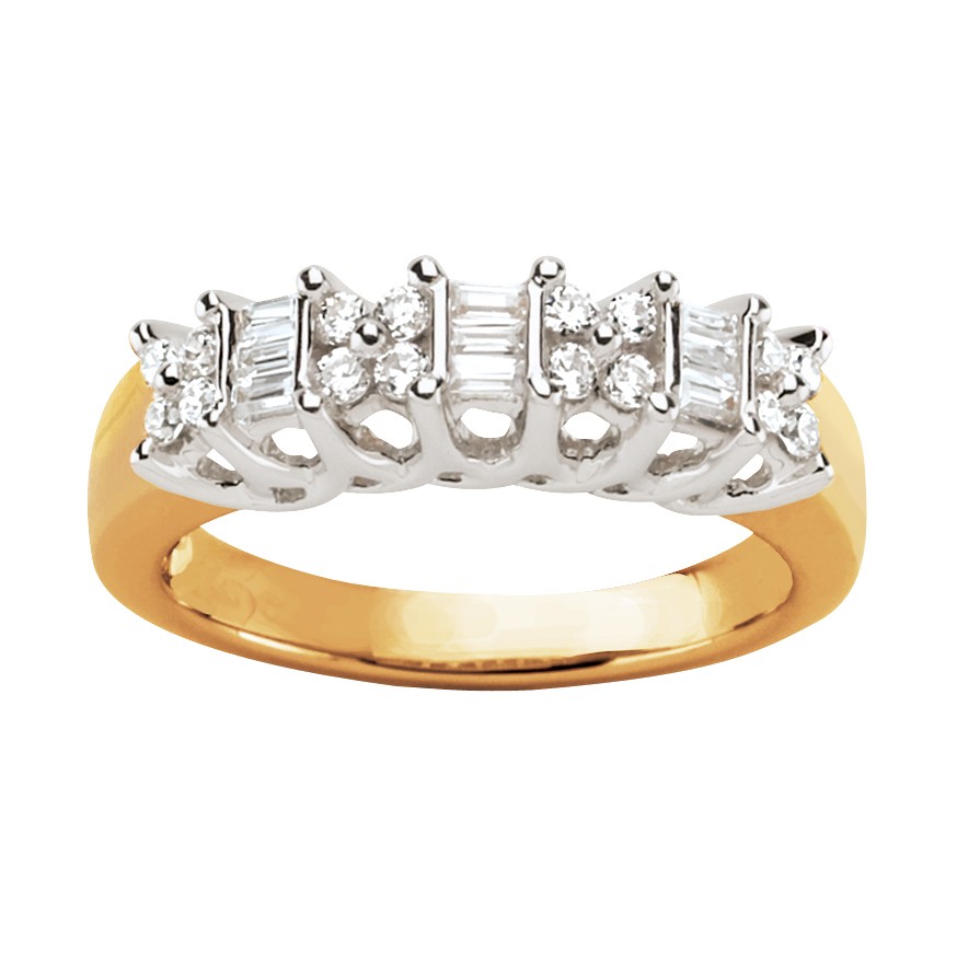 A wonderful feeling of life and light radiates from this elegant 25 diamond (1/2 ct. tw.)* ring. Sixteen round diamonds form shining flowers between vertical baguette diamonds and polished 10k yellow gold bars.