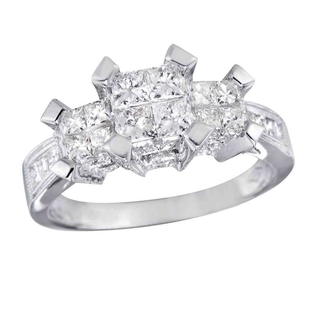 The brightest hopes for your future together shine in the design of this brilliant 74 diamond (2 Ct. t.w.)* engagement ring. Princess cut diamonds form a composite center and sides leading to a round diamond studded 14k white gold band.